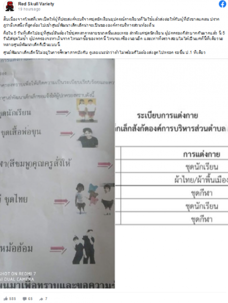 เรียกได้ว่าเป็นอีกหนึ่งเรื่องราวที่โซเชียลเข้ามาแสดงความคิดเห็นกันเป็นจำนวนมาก หลังวเพจ Red Skull Variety โพสต์ภาพระเบียบการแต่งตัวของเด็กนักเรียนที่ต้องใส่มา 5 วัน ซึ่งเป็นชุดที่ไม่ซ้ำกันในแต่ละวัน สร้างความลำบากใจให้กับผู้ปกครองที่ต้องเตรียมเงินมาซื้อเครื่องแต่งกายให้กับบุตรหลาน ซึ่งอาจไม่ใช่เรื่องที่มีความจำเป็นเท่าที่ควร