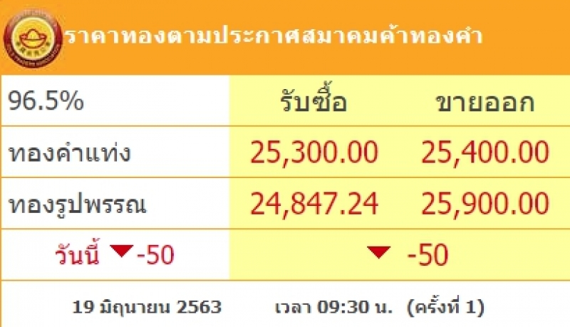 ราคาทองวันนี้ ราคาทองคำ ประจำวันศุกร์ที่ 19 มิถุนายน 2563 เวลา 09:30 น. (ครั้งที่ 1) ราคาทองคำปรับลง 50 บาท