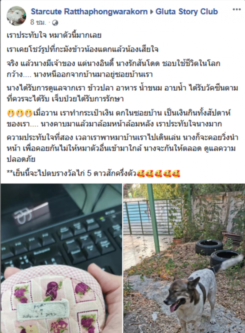 เรียกได้ว่าเป็นอีกหนึ่งเรื่องราวน่ารักๆ ที่สร้างรอยยิ้มในโลกออนไลน์ หลังจากที่ผู็ใช้เฟซบุ๊กชื่อ Starcute Ratthaphongwarakorn ได้โพสต์เรื่องราวลงในกลุ่ม Gluta Story Club ถึงเจ้าตูบผู้ซื่อสัตย์ หลังจากที่ตนทำกระเป๋าตังหาย