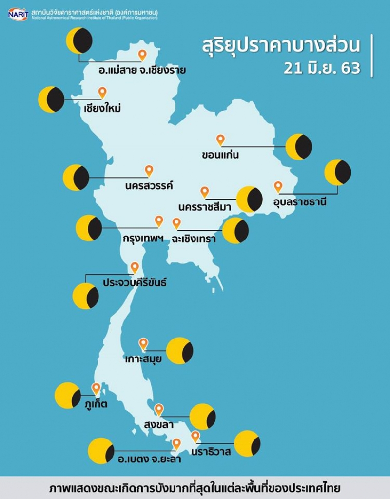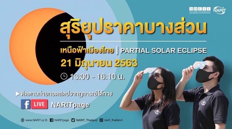 จากกรณีเพจ NARIT สถาบันวิจัยดาราศาสตร์แห่งชาติ ได้โพสต์ข้อความระบุว่า วันนี้แล้วนะครับ 21 มิถุนายน 2563 สุริยุปราคาบางส่วนเหนือฟ้าเมืองไทยในวันที่กลางวันยาวนานที่สุดในรอบปี ในวันนี้ จะเกิดปรากฏการณ์ สุริยุปราคาวงแหวน แนวคราสวงแหวนพาดผ่านสาธารณรัฐอัฟริกากลาง คองโก เอธิโอเปีย ตอนใต้ของปากีสถาน ตอนเหนือของอินเดีย และสาธารณรัฐประชาชนจีน ส่วนประเทศไทยจะเห็นเป็น สุริยุปราคาบางส่วน ดวงจันทร์บดบังดวงอาทิตย์เพียงบางส่วน ทำให้มองเห็นดวงอาทิตย์เว้าแหว่ง