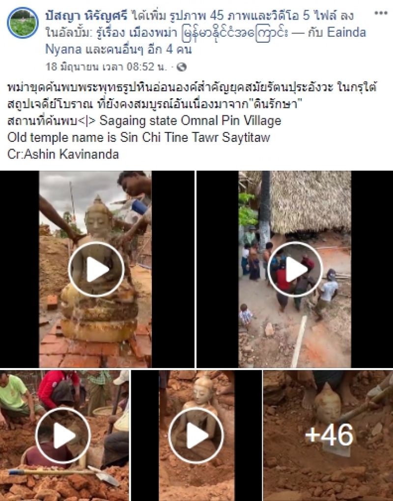 เรียกได้ว่าเป็นอีกหนึ่งเรื่องราวที่โซเชียลเข้ามาแสดงความคิดเห็นกันเป็นจำนวนมาก หลัง เฟซบุ๊กชื่อว่าปัสญา หิรัญศรี ได้ออกมาโพสต์ภาพ พร้อมทั้งได้ระบุข้อความว่า พม่าขุดค้นพบพระพุทธรูปหินอ่อนองค์สำคัญยุคสมัยรัตนปุระอังวะ ในกรุใต้สถูปเจดีย์โบราณ ที่ยังคงสมบูรณ์อันเนื่องมาจาก ดินรักษา สถานที่ค้นพบ Sagaing state Omnal Pin Village Old temple name is Sin Chi Tine Tawr Saytitaw