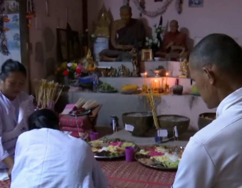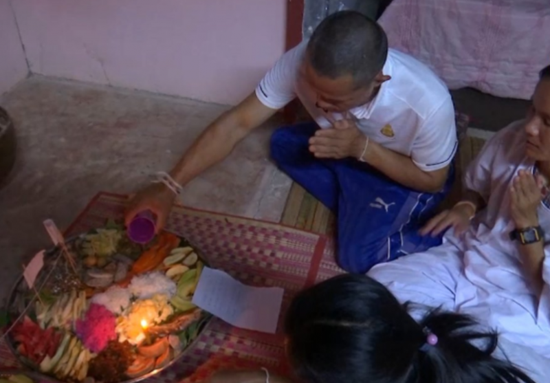 โดยแม่หมอให้จุดธูปคนละ 1 กำ และจุดเทียนพิธี 5 เล่ม จากนั้นให้จุดเทียน 108 เล่มในกระถาง จากนั้นมีการสวดสำเนียงอีสาน จับใจความได้ว่า มีการขอให้เทพแต่ละองค์ลงมารับอาหารที่เตรียมไว้ ขอให้เทพทั้งหลายลงมารับ โดยระหว่างนั้นมีการให้ทั้งสองคนขานชื่อคนในครอบครัวเป็นระยะ ๆ