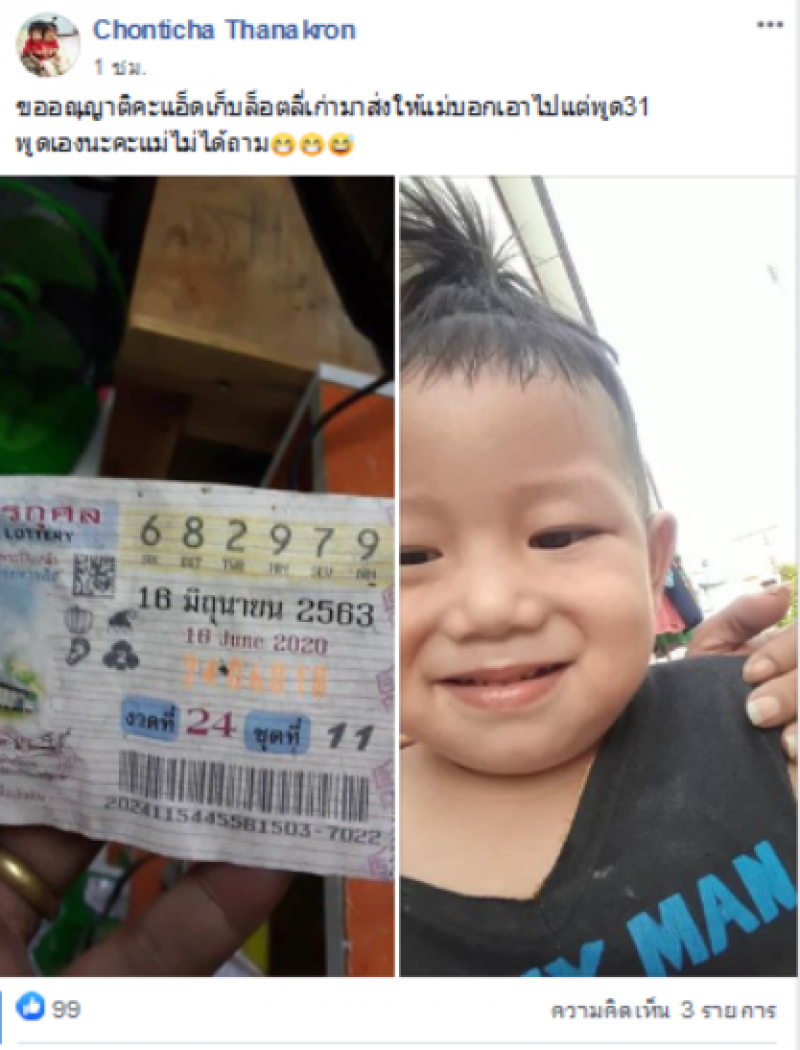 ได้ออกมาโพสต์ผ่านกลุ่มดัง พร้อมทั้งได้ระบุข้อความว่า ขออณุญาติคะแอ็ดเก็บล็อตเตอรี่เก่ามาส่งให้แม่บอกเอาไปแต่พูด 31 พูดเองนะคะแม่ไม่ได้ถาม