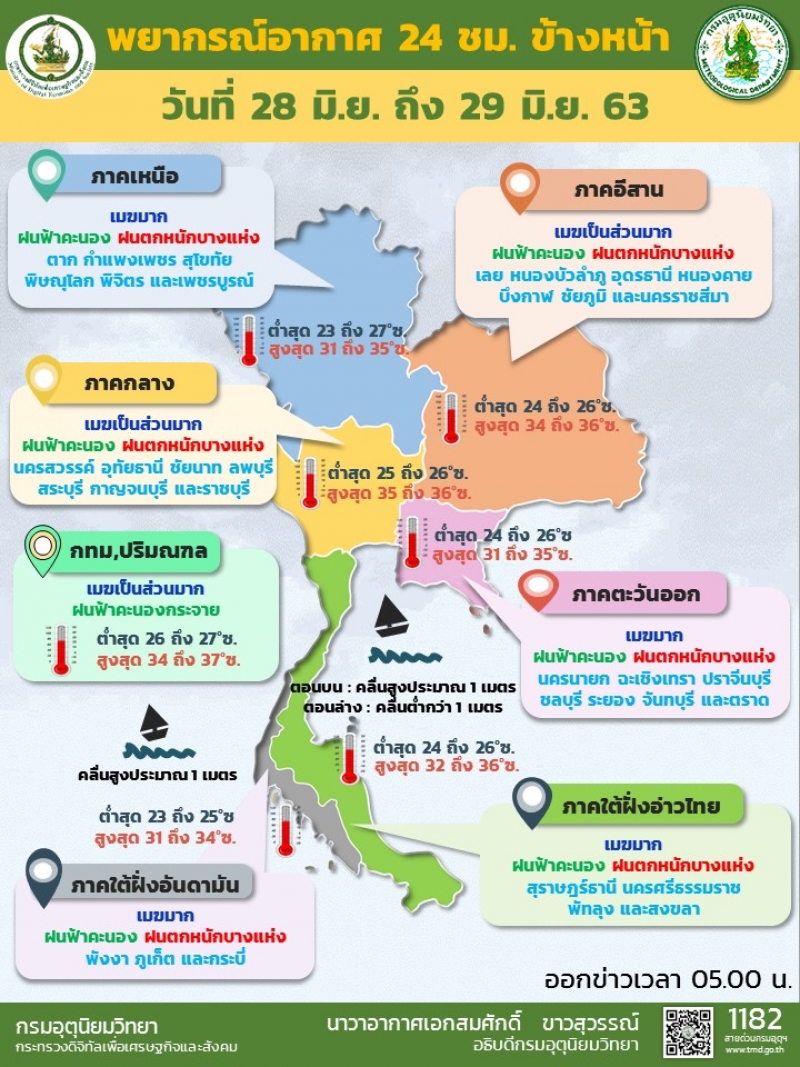 กรมอุตุฯ เผยรายงานแผนที่แสดงพื้นที่เสี่ยงภัยฝนตกหนักถึงหนักมาก ประจำวันที่ 28 มิถุนายน 2563 ตั้งแต่เวลา 06.00 น. ถึงเวลา 06.00 น. วันที่ 29 มิถุนายน 2563 โดยจังหวัดที่เป็นพื้นที่เสี่ยง ได้แก่ ตาก, สุโขทัย, กำแพงเพชร, พิจิตร, พิษณุโลก, เลย, หนองคาย, บึงกาฬ, อุดรธานี, หนองบัวลำภู, ชัยภูมิ, นครราชสีมา, เพชรบูรณ์, นครสวรรค์, อุทัยธานี, กาญจนบุรี, ราชบุรี, ชัยนาท, ลพบุรี, สระบุรี, นครนายก, ปราจีนบุรี, ฉะเชิงเทรา, ชลบุรี, ระยอง, จันทบุรี, ตราด, สุราษฎร์ธานี, พังงา, ภูเก็ต, กระบี่, นครศรีธรรม, พัทลุง และสงขลา
