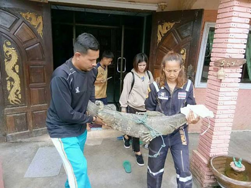 ทางเจ้าหน้าที่กู้ภัยจังหวัดอ่างทอง ที่ชำนาญในการจับสัตว์เลื้อยคลาน พร้อมอุปกรณ์ ได้เข้าทำการช่วยเหลือ พบว่า มีตัวเงินตัวทองขนาดใหญ่ มีท่าทางดุร้ายและหวาดระแวง ส่งเสียงขู่ตลอดเวลา นอนอยู่ใต้ทีวีภายในบ้านหลังดังกล่าว