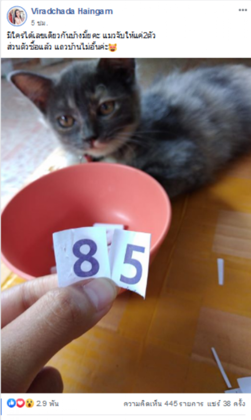 มีใครได้เลขเดียวกันบ้างมั้ยคะ แมวจับให้แค่ 2ตัว ส่วนตัวซื้อแล้ว แถวบ้านไม่อั้นค่ะ งานนี้ใครที่ซื้อกลับ 85 58 เข้าเต็มๆ