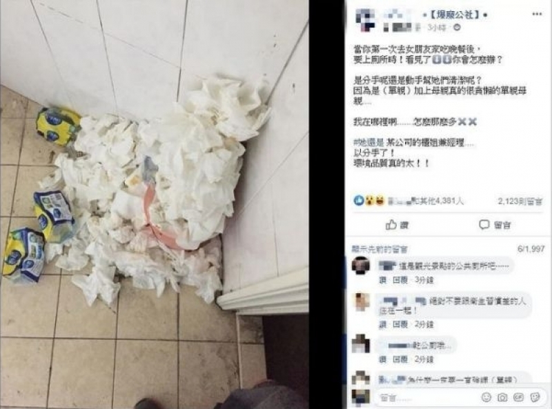 ผู้หญิงอะไรเนี้ยใช้กระดาษทิชชู่แล้วไม่ยอมเก็บไปทิ้ง ปล่อยให้ล้นออกมาตกเลอะเทอะเต็มพื้น เขายิ่งดูก็ยิ่งไม่สบายตามาก จึงรีบเข้าห้องน้ำแล้วรีบออกมาทันที ทันทีที่เขาโพสต์ไปได้ไม่นานก็มีชาวเน็ตพากันมาแสดงความคิดเห็นมากกว่า 4,000 คอมเมนต์ และเกิดเสียงวิพากษ์วิจารณ์กันมากมายว่า