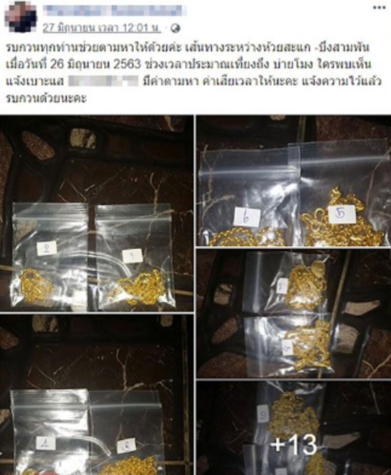 แต่ระหว่างทางได้มีรถเก๋งสีขาว ยี่ห้อนิสสันมาส ตบไฟสูงใส่ตนก็ไม่ได้เอะใจอะไร กระทั่งมารู้ตัวอีกที เมื่อถึงสี่แยกราหุล อำเภอบึงสามพัน พบว่าทำทองหล่นหาย จึงรีบขับรถย้อนกับมา เพราะมีความหวังว่าจะเจอทองและก็เข้าแจ้งความไว้เป็นหลักฐาน