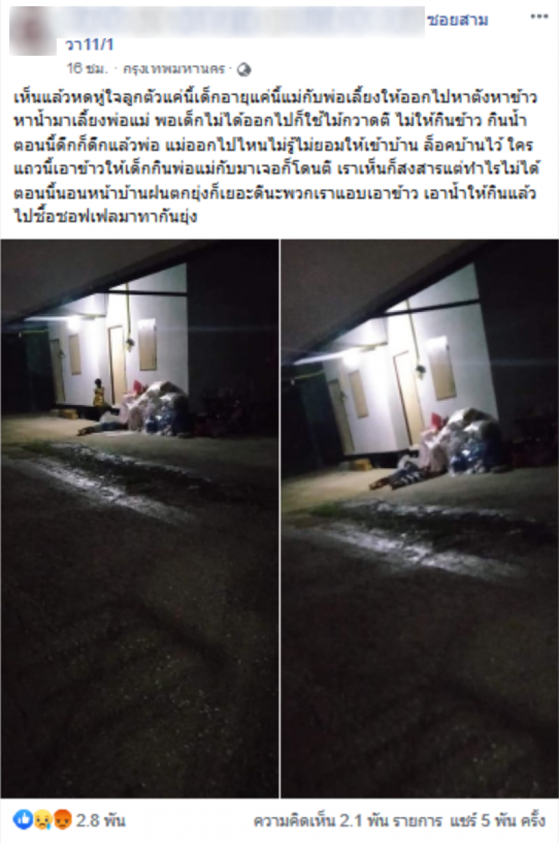 เห็นแล้วหดหู่ใจลูกตัวแค่นี้เด็กอายุแค่นี้แม่กับพ่อเลี้ยงให้ออกไปหาตังหาข้าว หาน้ำมาเลี้ยงพ่อแม่ พอเด็กไม่ได้ออกไปก็ใช้ไม้กวาดตี ไม่ให้กินข้าว กินน้ำ ตอนนี้ดึกก็ดึกแล้วพ่อ แม่ออกไปไหนไม่รู้ไม่ยอมให้เข้าบ้าน ล็อคบ้านไว้ ใครแถวนี้เอาข้าวให้เด็กกินพ่อแม่กับมาเจอก็โดนตี เราเห็นก็สงสารแต่ทำไรไม่ได้ ตอนนี้นอนหน้าบ้านฝนตกยุ่งก็เยอะดีนะพวกเราแอบเอาข้าว เอาน้ำให้กินแล้ว ไปซื้อซอฟเฟลมาทากันยุ่ง