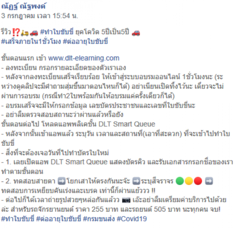 จากกรณีที่กรมการขนส่งทางบก ให้สำนักงานขนส่งทุกแห่งกลับมาเปิดให้บริการด้านใบอนุญาตขับรถและผู้ประจำรถ โดยปรับรูปแบบการดำเนินการเป็นแบบ New Normal ภายใต้การดำเนินการตามมาตรการด้านสาธารณสุขอย่างเคร่งครัด ล่าสุด ผู้ใช้เฟซบุ๊ก ณัฏฐ์ ณัฐพงค์ ได้โพสต์เฟซบุ๊กรีวิวการต่ออายุใบขับขี่ ที่ไม่ยุ่งยาก และเสร็จเร็วภายใน 1 ชั่วโมง โดยระบุว่า ลงทะเบียน กรอกรายละเอียดของตัวเราเอง
