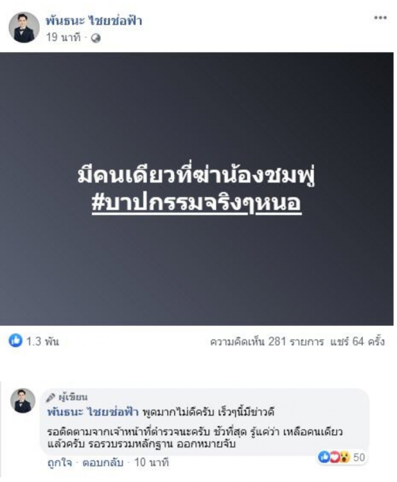 ต่อมา ในเฟซบุ๊ก พันธนะ ไชยช่อฟ้า โพสต์ข้อความระบุว่า มีคนเดียวที่ฆ่าน้องชมพู่#บาปกรรมจริงๆหนอ พร้อมระบุว่า พูดมากไม่ดีครับ เร็วๆนี้มีข่าวดี รอติดตามจากเจ้าหน้าที่ตำรวจนะครับ ชัวที่สุด รู้แค่ว่า เหลือคนเดียวแล้วครับ รอรวบรวมหลักฐาน ออกหมายจับ