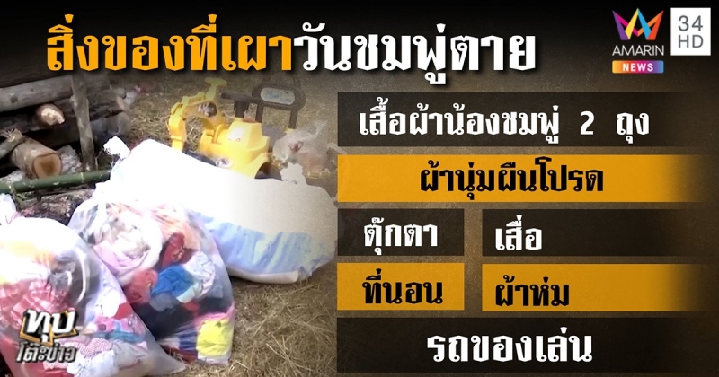 สอบถามข้อมูลจาก นางสมควร หลาบโพธิ์ เกี่ยวกับเสื้อผ้าที่เผาไปพร้อมศพน้องชมพู่ โดยเปิดเผยว่า สิ่งที่เผาไปพร้อมศพของน้องชมพู่นั้นมีเสื้อ และกางเกง ทั้งใหม่และเก่า ของเล่น ฟูกที่นอน หมอน และผ้าห่ม เป็นผ้าขนหนูนิ่ม ๆ ผืนใหญ่ที่น้องชมพู่ชอบกอดก่อนนอน ซึ่งเป็นผ้าที่น้องชมพู่ชอบมาก ถ้าไม่มีผ้านุ่มก็จะไม่ยอมนอนหลับ ได้เผารวมกันไปทั้งหมด