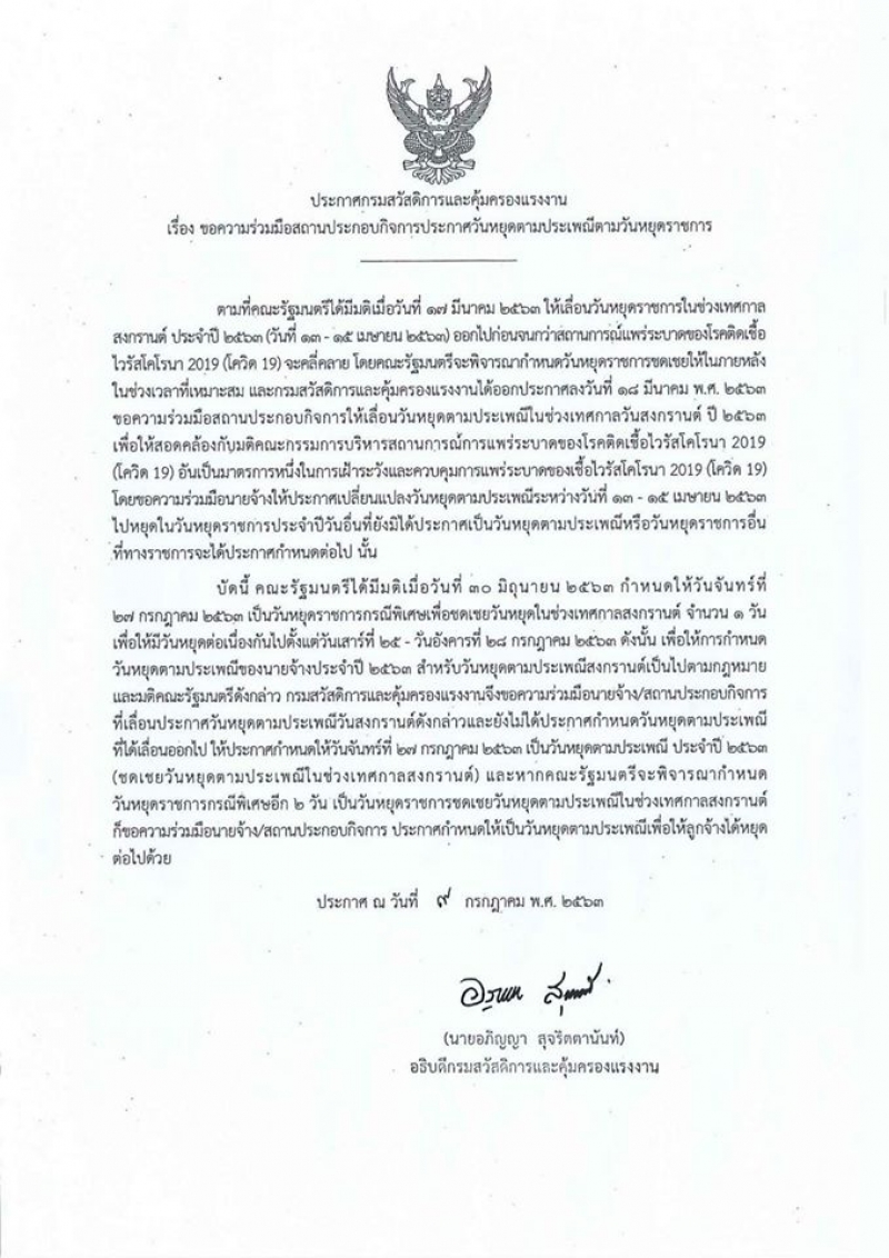 ทั้งนี้ หากคณะรัฐมนตรีจะพิจารณากำหนดวันหยุดราชการกรณีพิเศษอีก 2 วัน เป็นวันหยุดราชการชดเชยวันหยุดตามประเพณีในช่วงเทศกาลสงกรานต์ก็ขอความร่วมมือนายจ้าง สถานประกอบกิจการ ประกาศกำหนดให้เป็นวันหยุดตามประเพณีเพื่อให้ลูกจ้างได้หยุดต่อไปด้วย