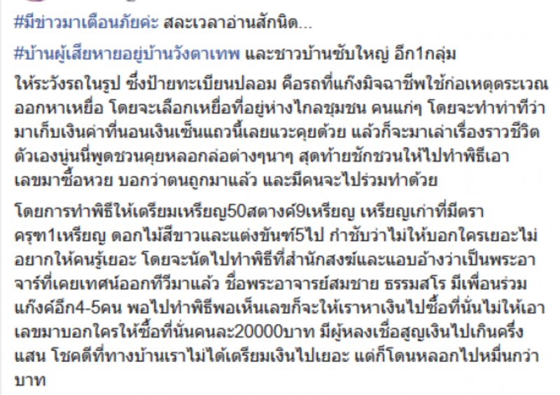 เรียกได้ว่าเป็นอีกหนึ่งเรื่องราว ที่ถูกพูดถึงในโซเชียล เมื่อมีสาวคนหนึ่ง ได้ออกมาโพสต์เล่าเรื่องราว เป็นเหตุการณ์เตือน ภัย หลังจากที่มีคนชราในหมู่บ้าน โดนกลุ่มคนซึ่งคาดว่าเป็นมิจฉาชีพ ตระเวนขับรถกระบะที่ใส่แผ่นป้ายทะเบียนแปลกๆ ที่ถูกเขียนตัวเลขขึ้นมาเอง โดยผู้โพสต์ได้เล่าว่า