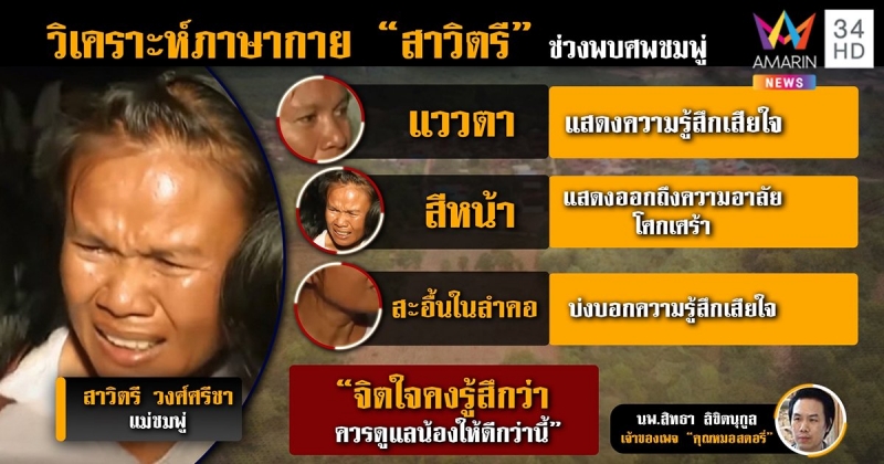 ส่วนปฏิกิริยาของนางสาวิตรี แม่ของน้องชมพู่ เท่าที่ตนดูคลิป พบว่าสีหน้าแววตาของแม่เสียใจจริง ๆ แม้ไม่ได้ฟูมฟาย แต่สีหน้าได้แสดงออกถึงความอาลัยอย่างแท้จริง สีหน้าสอดคล้องกับความโศกเศร้าและเรื่องราวที่เกิดขึ้น แต่คุณแม่เท่าที่ตนติดตามข่าวมา คุณแม่เป็นคนเข้มแข็ง อาจจะไม่ได้โวยวายเสียงดังมากมาย