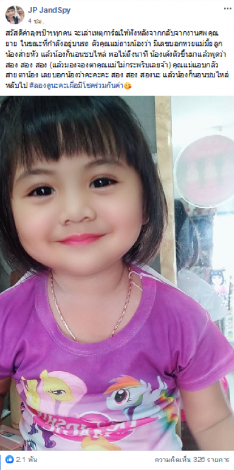 ตัวคุณแม่ถามน้องว่า มีเลขบอกไหมน้องส่ายหัว แล้วน้องก็นอนซบไหล่ พอไม่ถึงนาที น้องเด้งตัวขึ้นมาแล้วพูดว่า สอง สอง สอง (แล้วมองจองตาคุณแม่ไม่กระพริบเลยจ้า) คุณแม่แอบกลัวสายตาน้อง เลยบอกน้องว่าคะคะคะ สอง สอง สองนะ แล้วน้องก็นอนซบไหล่หลับไป