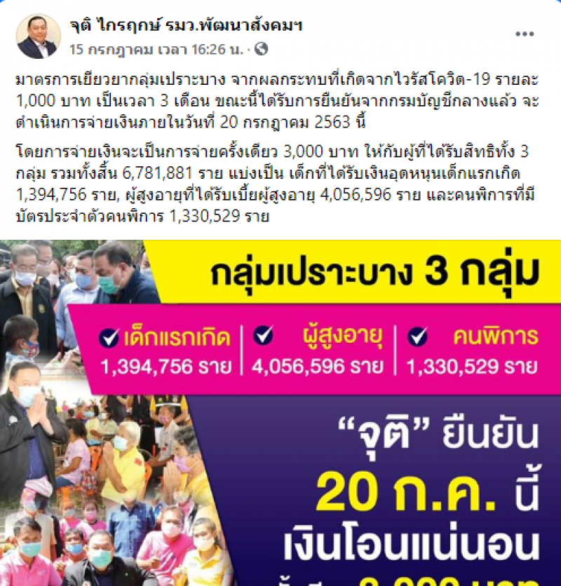 นายจุติ ไกรฤกษ์ รัฐมนตรีว่าการกระทรวงพัฒนาสังคมและความมั่นคงของมนุษย์ ได้โพสต์ข้อความผ่านทางเฟซบุ๊ก จุติ ไกรฤกษ์ รมว.พัฒนาสังคมฯ เกี่ยวกับเงินเยียวยากลุ่มเปราะบาง โดยระบุว่า มาตรกช่วยกลุ่มเปราะบาง จากผลกระทบที่เกิด covid 19 รายละ 1,000 บาท เป็นเวลา 3 เดือน