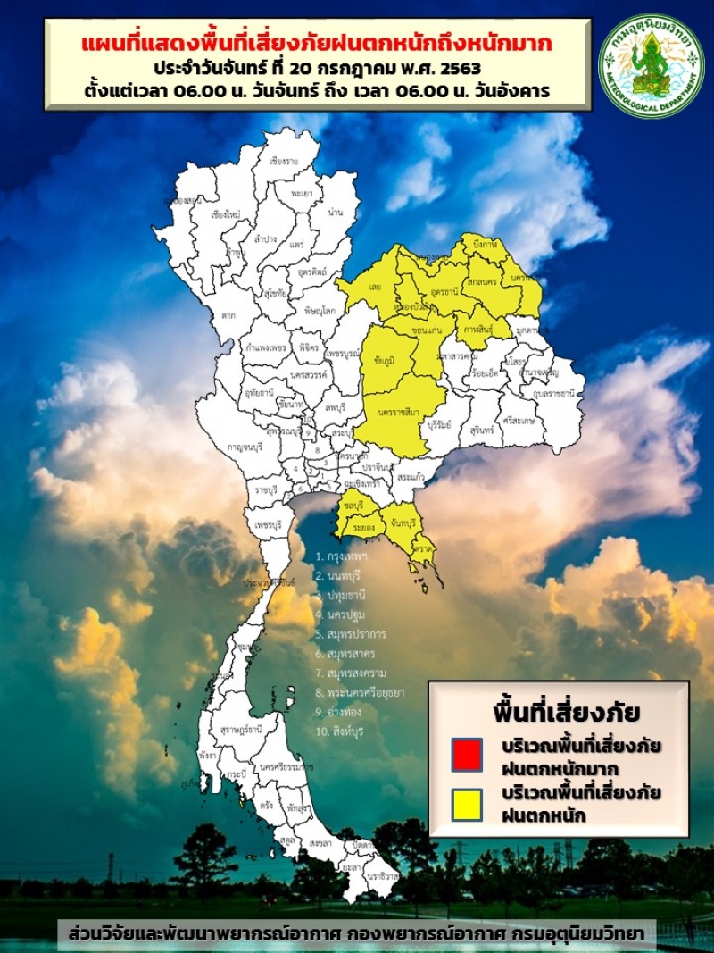 กรมอุตุฯ รายงานแผนที่แสดงพื้นที่เสี่ยงภัยฝนตกหนักถึงหนักมาก ประจำวันที่ 20 กรกฎาคม 2563 ตั้งแต่เวลา 06.00 น. ถึงเวลา 06.00 น. วันที่ 21 กรกฎาคม 2563 โดยจังหวัดที่เป็นพื้นที่เสี่ยงได้แก่ เลย, หนองคาย, บึงกาฬ, นครพนม, สกลนคร, อุดรธานี, หนองบัวลำภู, ชัยภูมิ, ขอนแก่น, กาฬสินธุ์, นครราชสีมา, ชลบุรี, ระยอง, จันทบุรี และตราด