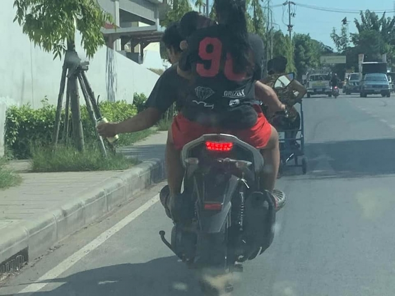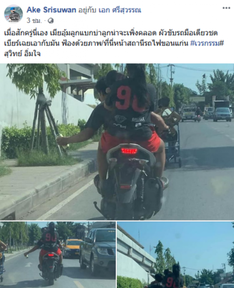 วันที่ 24 กรกฎาคม มีรายงานว่า ผู้ใช้เฟซบุ๊กชื่อ Ake Srisuwan ได้มีการโพสต์ภาพสุดสะเทือนใจ โดยเป็นภาพขณะที่พ่อแม่ลูก กำลังขี่รถจักรยานยนต์ แต่ทว่าคนขับซึ่งคาดว่าเป็นพ่อ ได้ขับรถมือเดียว อีกมือก็ถือกระป๋องเบียร์ ซดไปด้วยขณะขับขี่ ทั้งที่มีผู้หญิงอุ้มลูกน้อยซ้อนท้ายมาด้วย โดยผู้โพสต์ระบุว่า เมื่อสักครู่นี่เอง เมียอุ้มลูกแบกบ่าลูกน่าจะเพิ่งคลอด ผัวขับรถมือเดียวชดเบียร์เฉยเอากับมัน ฟ้องด้วยภาพ/ที่นี่หน้าสถานีรถไฟขอนแก่น เวรกรรม