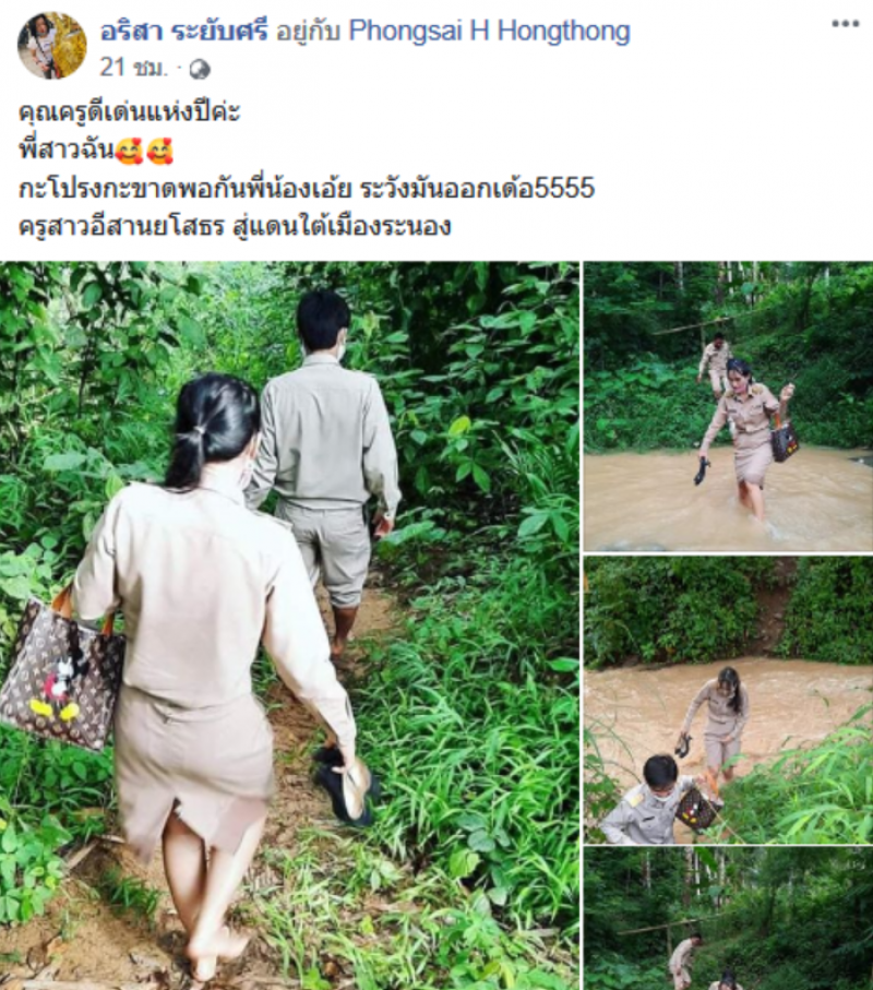 เรียกได้ว่าเป็นอีกหนึ่งเรื่องราว ที่ได้รับเสียงชื่นชมเป็นอย่างมากในโลกออนไลน์ เมื่อผู้ใช้เฟซบุ๊กชื่อ อริสา ระยับศรี ได้มีการโพสต์ภาพคุณครู จากโรงเรียนบ้านปากแพรก ที่กำลังเดินลุยน้ำลุยป่า เพื่อที่จะไปเยี่ยมบ้านนักเรียน โดยผู้โพสต์ระบุว่า คุณครูดีเด่นแห่งปีค่ะ พี่สาวฉัน กะโปรงกะขาดพอกันพี่น้องเอ้ย ระวังมันออกเด้อ5555 ครูสาวอีสานยโสธร สู่แดนใต้เมืองระนอง ในภาพอาจจะมี หนึ่งคนขึ้นไป ผู้คนกำลังยืน ต้นพืช สถานที่กลางแจ้ง และธรรมชาติ