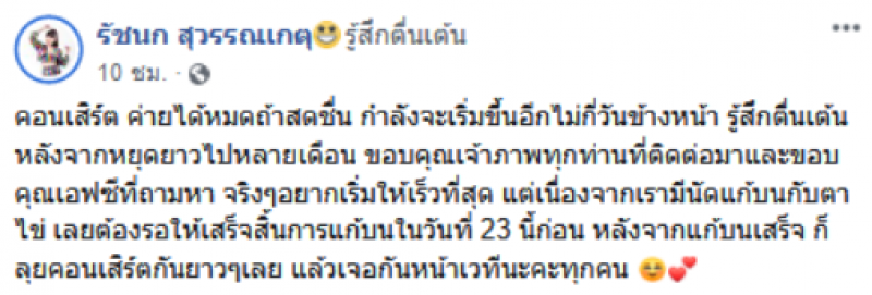 ล่าสุด วันที่ 22ก.ค. ที่ผ่านมา ได้ออกมาเผยข่าวดีว่า เร็วนี้จะมีคอนเสิร์ตแล้วจ้า ท่ากลางความยินดีของเหล่าแฟนคลับทุกคนรวมถึงคนในค่ายอีกด้วย ซึ่งเจนนี่ระบุข้อความว่า คอนเสิร์ต ค่ายได้หมดถ้าสดชื่น กำลังจะเริ่มขึ้นอีกไม่กี่วันข้างหน้า รู้สึกตื่นเต้น หลังจากหยุดไปหลายเดือน ขอบคุณเจ้าภาพทุกท่านที่ติดต่อมาและขอบคุณเอฟซีที่ถามหา จริงๆอยากเริ่มให้เร็วที่สุด