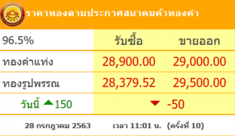 วันที่ 28 กรกฎาคม 2563 ผู้สื่อข่าวรายงานว่า หลังจากที่สมาคมค้าทองคำรายงาน ราคาทองไทย โดยราคาทองล่าสุดวันนี้ ได้ปรับขึ้นต่อเนื่องอีก หลังจากที่ได้มีการปรับพุ่งขึ้นต่อเนื่องมาตลอด รวมเป็นวันนี้ ปรับขึ้นมาอีก 150 บาท ทำให้ราคาขึ้งสูงสุดในรอบปี โดยราคาล่าสุดวันนี้ ทองคำแท่ง รับซื้อบาทละ 28,900 ขายออกบาทละ 29,000 บาท ส่วนทองรูปพรรณ รับซื้อบาทละ 28,379.52 ขายออกบาทละ 29,500 บาท