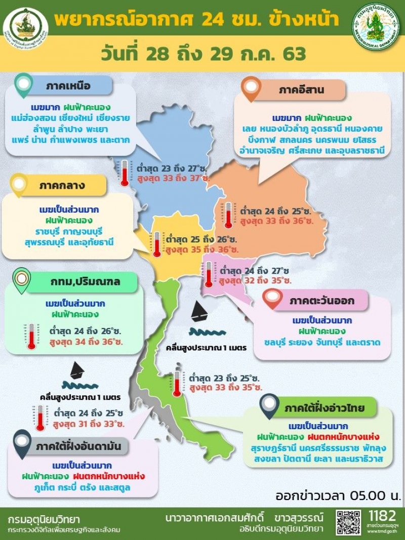 ลักษณะอากาศทั่วไป อากาศ 24 ชั่วโมงข้างหน้า มรสุมตะวันตกเฉียงใต้กำลังอ่อนที่พัดปกคลุมทะเลอันดามันและประเทศไทยเริ่มมีกำลังแรงขึ้น ประกอบกับมีหย่อมความกดอากาศต่ำปกคลุมประเทศลาวและเวียดนามตอนบน ลักษณะเช่นนี้ทำให้ภาคเหนือและภาคตะวันออกเฉียงเหนือเริ่มมีการกระจายของฝนเพิ่มขึ้น สำหรับภาคใต้ยังคงมีฝนตกต่อเนื่อง และมีฝนตกหนักบางแห่ง ขอให้ประชาชนบริเวณดังกล่าวระวังอันตรายจากฝนที่ตกหนักไว้ด้วย ฝุ่นละอองขนาดเล็ก เนื่องจากขณะนี้ประเทศไทยอยู่ในช่วงฤดูฝน ดังนั้นการเกิดหรือการสะสมของฝุ่นละออง/หมอกควัน ไม่มีหรือมีน้อยในช่วงฤดูฝน