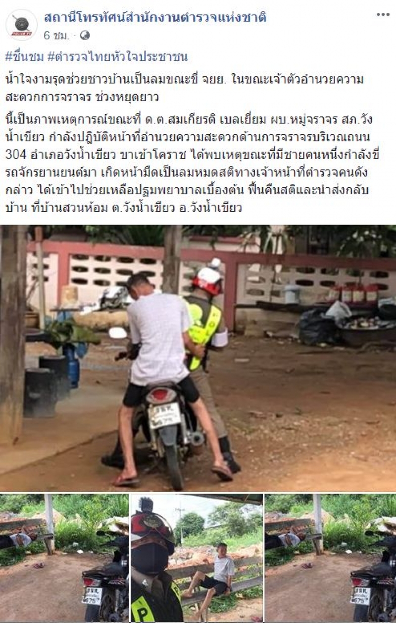 ตำรวจจราจร สภ.วังน้ำเขียว ช่วยชายเป็นลมข้างทางนอนที่พงหญ้าข้างทาง พร้อมขี่รถพาไปส่งถึงบ้านด.ต. สมเกียรติ เบลเยี่ยม ผบ.หมู่จราจร สภ.วังน้ำเขียวพบชายคนหนึ่งกำลังขี่รถจักรยานยนต์มา เกิดหน้ามืดเป็นลม