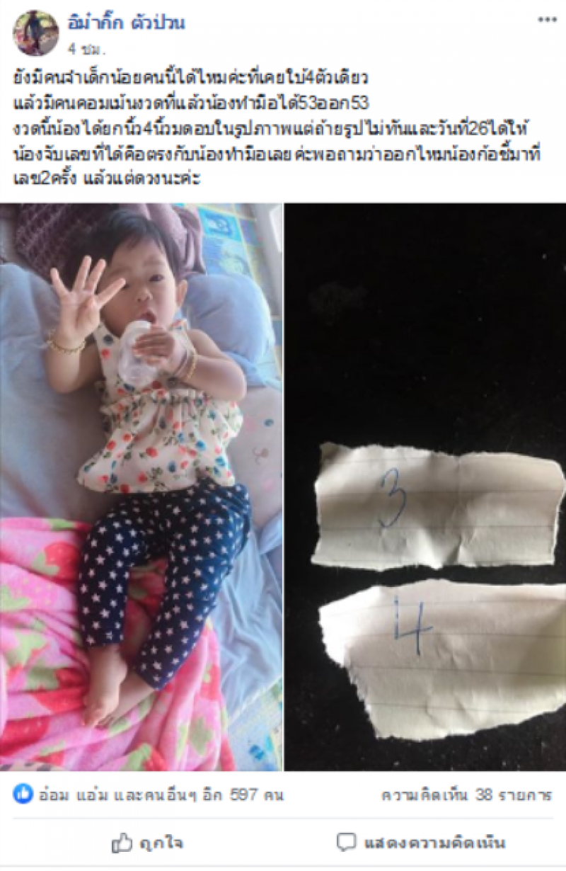 ยังมีคนจำเด็กน้อยคนนี้ได้ไหมค่ะที่เคยใบ้4ตัวเดียวแล้วมีคนคอมเม้นท์ รอบที่แล้วน้องทำมือได้53ออก53 รอบดนี้น้องได้ยกนิ้ว4นิ้วมดอบในรูปภาาพแต่ถ้ายรูปไม่ทันและวันที่26ได้ให้น้องจับเลขที่ได้คือตรงกับน้องทำมือเลยค่ะพอถามว่าออกไหมน้องก็ชี้มาที่เลข2ครั้ง