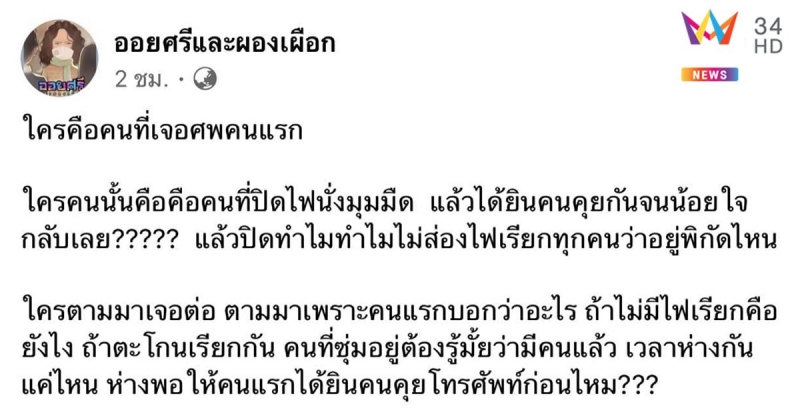 กรณีแฟนเพจเฟซบุ๊ก ออยศรีและผองเผือก โพสต์ข้อความว่า ใครคือคนที่เจอศพคนแรก ใครคนนั้นคือคือคนที่ปิดไฟนั่งมุมมืด แล้วได้ยินคนคุยกันจนน้อยใจกลับเลย แล้วปิดทำไมทำไมไม่ส่องไฟเรียกทุกคนว่าอยู่พิกัดไหน เวลาห่างกันแค่ไหน ห่างพอให้คนแรกได้ยินคนคุยโทรศัพท์ก่อนไหม