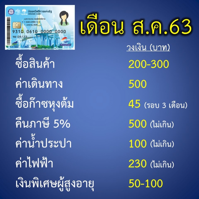 สำหรับการนำบัตรคนจนไปรูดซื้อสิ้นค้ากับร้านที่เข้าร่วมโครงการคืนภาษีสูงสุด 500 บาท / 5.เงินช่วยเหลือค่าน้ำประปา 100 บาท / 6.เงินช่วยเหลือค่าไฟฟ้า 230 บาท / 7.วงเงินพิเศษสำหรับผู้สูงอายุที่มีบัตรคนจน 50 100 บาท ตามเกณฑ์รายได้