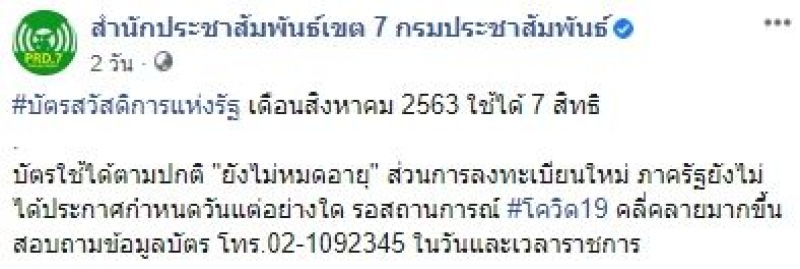 ได้เฮกันต่อเนื่องสำหรับท่านที่มี บัตรสวัสดิการแห่งรัฐ หรือว่า บัตรคนจน หลังจากที่เพจ สำนักประชาสัมพันธ์เขต 7 กรมประชาสัมพันธ์ ได้โพสต์ข้อความระบุว่า