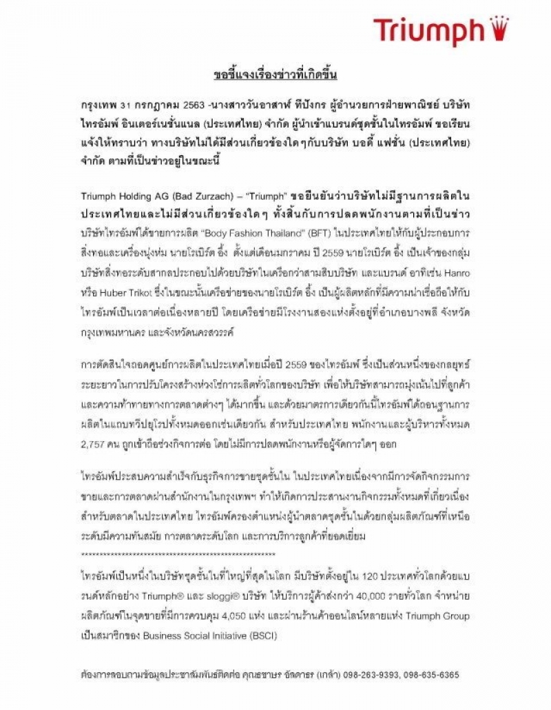 โดยเอกสารระบุว่า Triumph ขอยืนยันว่า บริษัทไม่มีฐานการผลิตในประเทศไทย และไม่มีส่วนเกี่ยวข้องใด ๆ ทั้งสิ้น กับการปลดพนักงานตามที่เป็นข่าว โดย บริษัทไทรอัมพ์ได้ขายการผลิต Body Fashion Thailand (BFT) ในประเทศไทย ตั้งแต่เดือนมกราคม 2559 ซึ่งเป็นส่วนหนึ่งของกลยุทธ์ระยะยาว ในการปรับโครงสร้างห่วงโซ่การผลิตทั่วโลกของบริษัท เพื่อให้บริษัทสามารถมุ่งเน้นไปที่ลูกค้า และความท้าทายทางการตลาดต่างๆ ได้มากขึ้น