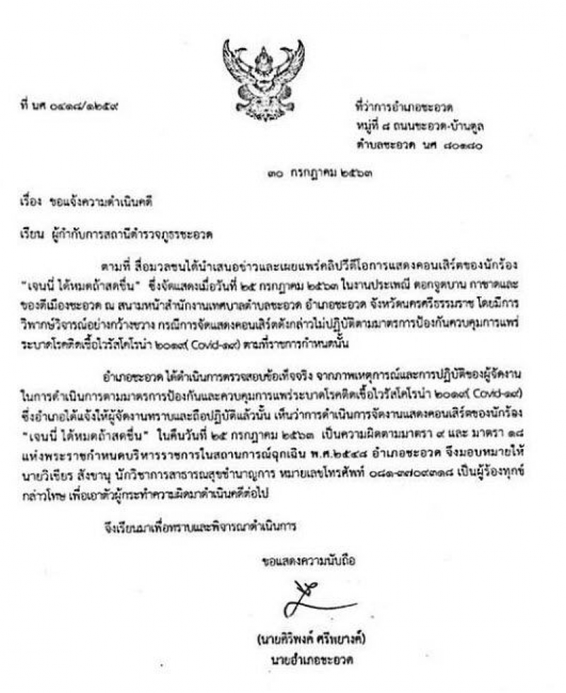 นายอำเภอ แจ้งจับ จัดคอนเสิร์ต เจนนี่ ได้หมดถ้าสดชื่น
