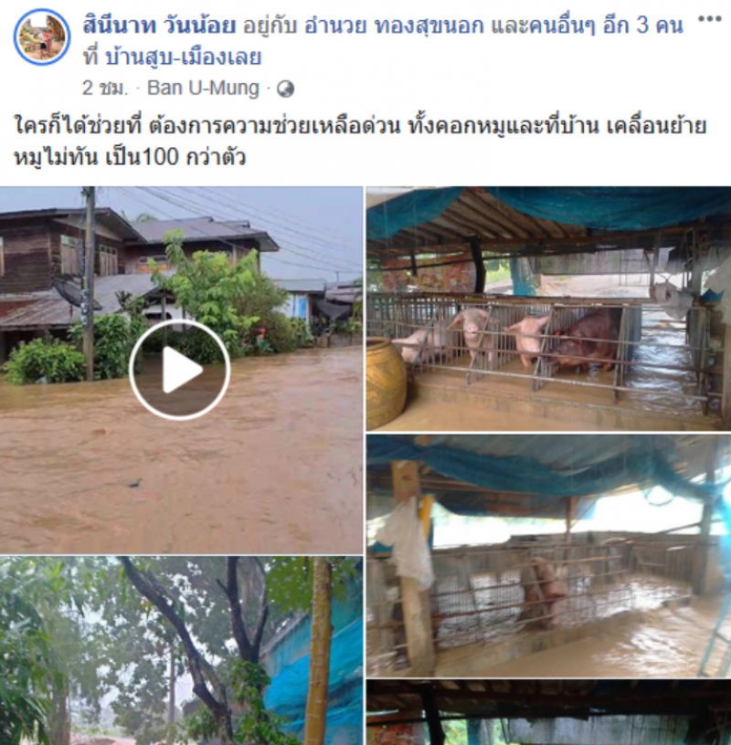 ทั้งนี้ มีรายงานว่า ผู้ใช้เฟซบุ๊กชื่อ สินีนาท วันน้อย ได้มีการโพสต์คลิปและภาพ ขอความช่วยเหลือด่วน ก่อนที่น้ำจะเพิ่มระดับจนท่วมสูงขึ้น โดยระบุว่า ใครก็ได้ช่วยที่ ต้องการความช่วยเหลือด่วน ทั้งคอกหมูและที่บ้าน เคลื่อนย้ายหมูไม่ทัน เป็น100 กว่าตัว ซึ่งขณะนี้ยังไม่ทราบชะตากรรม
