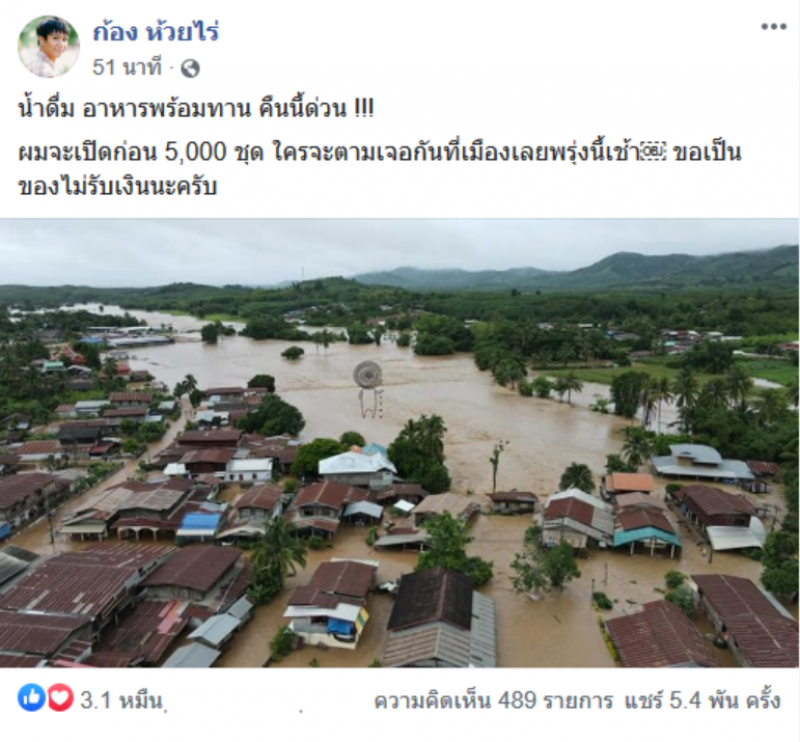ล่าสุดมีรายงานว่า หนุ่มนักร้องคนดัง ก้อง ห้วยไร่ ก็ได้มีการเคลื่อนไหว เตรียมเข้าช่วยเหลือพี่น้องเมืองเลยด้วยเช่นกัน โดยหนุ่มก้องได้โพสต์ว่า น้ำดื่ม อาหารพร้อมทาน คืนนี้ด่วน ผมจะเปิดก่อน 5,000 ชุด ใครจะตามเจอกันที่เมืองเลยพรุ่งนี้เช้า ขอเป็นของไม่รับเงินนะครับ
