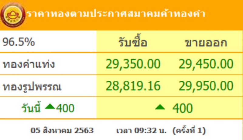 วันที่ 5 สิงหาคม 2563 ผู้สื่อข่าวรายงานว่า สมาคมค้าทองคำรายงาน ราคาทองคำไทยเมื่อเวลา 09:32 น. โดยราคาทองล่าสุดวันนี้ ได้มีการปรับขึ้นสูงถึง 400 บาท หลังจากที่ได้มีการปรับพุ่งขึ้นต่อเนื่องมาตลอด ทำให้ราคาทองขึ้งสูงสุดในรอบปี โดยราคาล่าสุดวันนี้ ทองคำ แท่ ง รับซื้อบาทละ 29,350 ขายออกบาทละ 29,450 บาท ส่วนทองรูปพรรณ รับซื้อบาทละ 28,819.16 ขายออกบาทละ 29,950 บาท