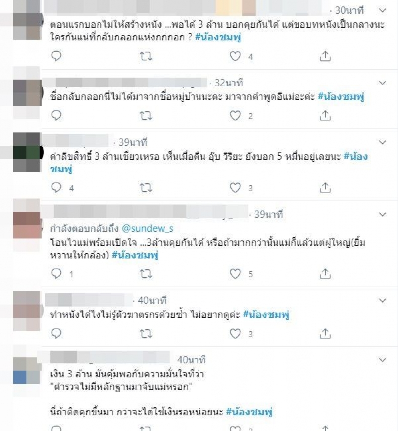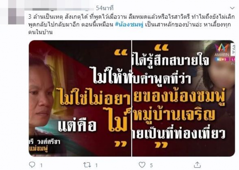 ซึ่งทางผู้คนในทวิตเตอร์ก็ได้พากันสงสัย ตั้งข้อสังเกตุว่าเหตุใด ทำไมเเม่น้องชมพู่ถึงได้ยอมใจอ่อนเปลี่ยนใจ ก็น่าจะเป็นเพราะเงินจำนวน 3 ล้านบาท 3 ล้านเป็นเหตุ สังเกตุได้ ที่พูดไว้เมื่อวาน ลืมหมดแล้วหรือไรสาวิตรี ทำไมถึงยังไม่เลิกพูดกลับไปกลับมาอีก ตอนนี้เหมือน น้องชมพู่ เป็นเสาหลักของบ้านอ่ะ หาเลี้ยงทุกคนในบ้าน