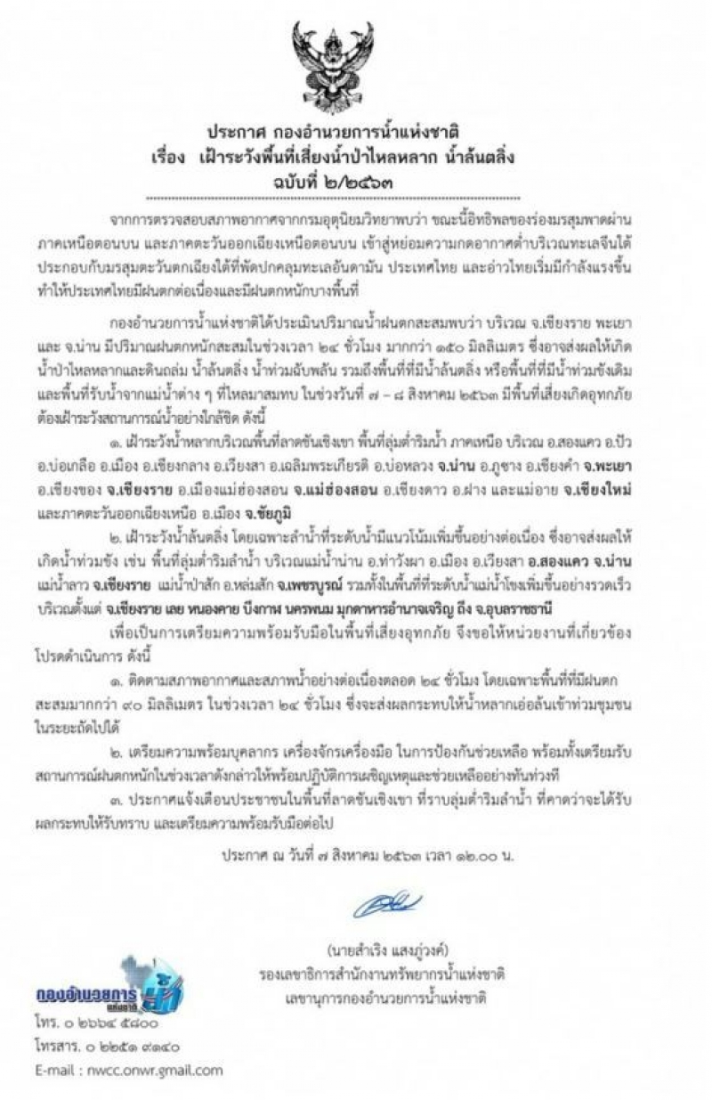 กองอำนวยการน้ำแห่ชาติได้ประเมินปริมาณน้ำฝนตกสะสมพบว่า บริเวณ จ.เชียงราย พะเยา และ จ.น่าน มีปริมาณฝนตกหนักสะสมในช่วงเวลา 24 ชั่วโมง มากกว่า 150 มิลลิเมตร ซึ่งอาจส่งผลให้เกิดน้ำป่าไหลหลากและดินถล่ม น้ำล้นตลิ่ง น้ำท่วมฉับพลัน รวมถึงพื้นที่ที่มีน้ำล้นตลิ่ง หรือพื้นที่ที่มีน้ำท่วมขังเดิมและพื้นที่รับน้ำจากแม่น้ำต่างๆ ที่ไหลมาสมทบ ในช่วงวันที่ 7-8 สิหาคม 2563 มีพื้นที่เสี่ยงเกิดอุทกภัย ต้องฝ้าระวังสถานการณ์น้ำอย่างใกล้ชิด ดังนี้