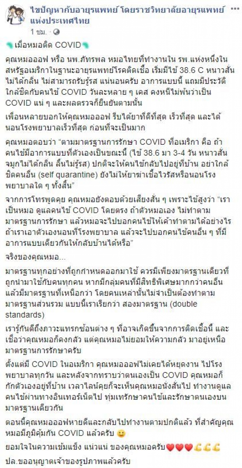 เพจเฟซบุ๊ก ไขปัญหากับอายุรแพทย์ โดยราชวิทยาลัยอายุรแพทย์แห่งประเทศไทย เล่าเรื่องราวของคุณหมอชาวไทยที่ติดเชื้อโควิด-19 หลังคลุกคลีกับคนไข้มาเป็นเวลานาน ทว่าสิ่งที่น่านับถือคือคุณหมอไม่ใช่สิทธิพิเศษใดๆ และยังคงรักษามาตรฐานการรักษาคนไข้ โดยบอกว่าหากตัวหมอยังต้องนอนโรงพยาบาล จะไปบอกให้คนไข้ที่มีอาการเดียวกันกลับไปกักตัวอยู่ที่บ้านได้อย่างไร