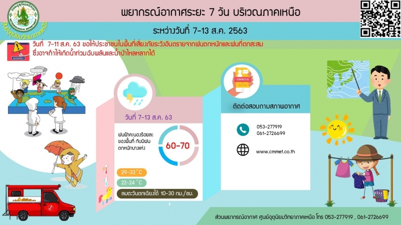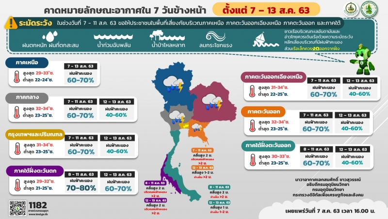 เพราะฉะนั้น ในช่วงวันที่ 8 - 11 ส.ค. 63 ขอให้ประชาชนในพื้นที่เสี่ยงภัยบริเวณภาคเหนือ ภาคตะวันออกเฉียงเหนือ ภาคตะวันออก และภาคใต้ ระวังอันตรายจากฝนตกหนักและฝนที่ตกสะสม ซึ่งอาจทำให้เกิดน้ำท่วมฉับพลันและน้ำป่าไหลหลากได้ และลมกระโชกแรง สำหรับชาวเรือบริเวณทะเลอันดามันและอ่าวไทยควรเดินเรือด้วยความระมัดระวัง หลีกเลี่ยงบริเวณที่มีฝนฟ้าคะนอง ส่วนเรือเล็กควรงดออกจากฝั่ง