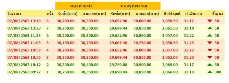 ราคาทองคำแท่ง-รูปพรรณ ในประเทศไทย วันที่ 7 ส.ค.2563 ผันผวนต่อเนื่อง ล่าสุด เมื่อเวลา 13:48 น. ราคาทองไทย(ปรับครั้งที่ 8)