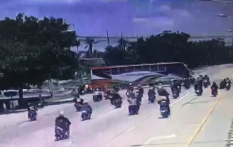 เรียกได้ว่าเป็นอีกหนึ่งเหตุการระทึก ผู้สื่อข่าวรายงานว่า ในโลกออนไลน์ ได้มีการเผยคลิปอุบัติเหตุ ขณะที่รถสิบล้อคันหนึ่ง กำลังลากรถบัสโดยใช้เชือกสลิง ขับข้ามถนนซึ่งเป็นทางแยก ก่อนที่จะมีกลุ่มรถจักรยานยนต์จำนวนหลายคัน ขี่มาด้วยความเร็วแล้วหักหลบไปทางด้านหน้ารถบัส โดยที่ไม่รู้ว่ามีเชือกสลิงอยู่ ทำให้เกิดอุบัติเหตุเชือกสลิงเกี่ยวกลุ่มรถจักรยานยนต์อย่างจัง เสียหลักล้มก่อนที่คันที่ตามมาทีหลังจะเบรคทัน ซึ่งจากเหตุการณ์ดังกล่าว ทำให้มีผู้เสียชีวิตในที่เกิดเหตุเบื่องต้นมีรายงานว่าเสียชีวิต 3 ราย โดยมีภาพจากกล้องวงจรปิด สามารถบันทึกภาพขณะเกิดอุบัติเหตุเอาไว้ได้