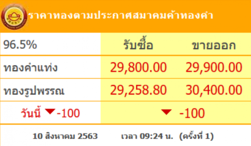 วันที่ 10 สิงหาคม 2563 ผู้สื่อข่าวรายงานว่า สมาคมค้าทองคำรายงาน ราคาทองคำไทยเมื่อเวลา 09:24 น. โดยราคาทองล่าสุดวันนี้ ราคาเริ่มปรับลดลงแล้ว หลังจากที่ได้มีการปรับพุ่งขึ้นต่อเนื่องมาตลอด ทำให้ราคาทองขึ้งสูงสุดในรอบปี ซึ่งวันที่ 8 สิงหาคมได้ปรับลดลง 300 บาท และราคาล่าสุดวันนี้ ปรับลดลงอีก 100 บาท แต่ก็ยังอยู่ในระดับที่สูงเกิน 30,000 บาท โดยวันนี้ทองคำแท่ง รับซื้อบาทละ 29,800 ขายออกบาทละ 29,900 บาท ส่วนทองรูปพรรณ รับซื้อบาทละ 29,258.80 ขายออกบาทละ 30,400 บาท