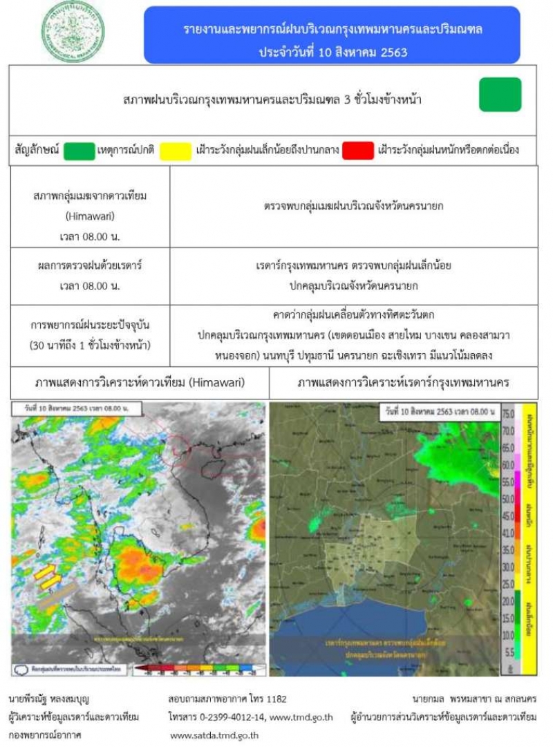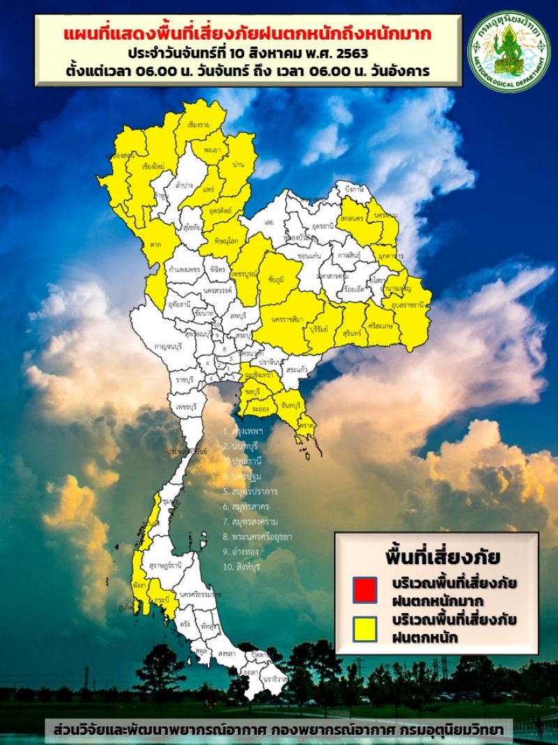 วันที่ 10 ส.ค. กรมอุตุฯ อากาศ 24 ชั่วโมงข้างหน้า ร่องมรสุมพาดผ่านภาคเหนือตอนบนและภาคตะวันออกเฉียงเหนือตอนบน เข้าสู่หย่อมความกดอากาศต่ำกำลังแรงบริเวณทะเลจีนใต้ตอนบน ประกอบกับมรสุมตะวันตกเฉียงใต้ที่พัดปกคลุมทะเลอันดามัน ประเทศไทย และอ่าวไทยมีกำลังแรง ทำให้ยังมีฝนตกหนักบางพื้นที่บริเวณภาคเหนือ ภาคตะวันออกเฉียงเหนือ ภาคตะวันออก และภาคใต้ฝั่งตะวันตก ขอให้ประชาชนที่อาศัยในพื้นที่เสี่ยงภัยบริเวณภาคเหนือ และภาคใต้ฝั่งตะวันตก ระวังอันตรายจากฝนตกหนักและฝนที่ตกสะสมไว้ด้วย อาจทำให้เกิดน้ำท่วมฉับพลัน และน้ำป่าไหลหลากได้