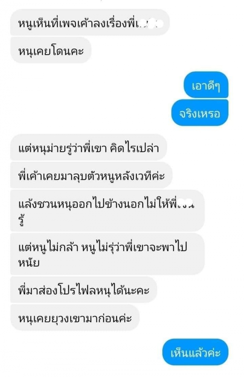 บทสนทนาระหว่างสาวปริศนากับแอดมินเพจคือเธอได้ทักแชทมาหาทางเพจเล่าว่าเห็นเพจเล่นข่าวเรื่องแฟนเจ้าของค่ายเพลงนี้ตนจึงอยากมาเล่าเรื่องที่เกิดขึ้นกับตัวเอง ตนเคยเป็นเด็กในวงของค่ายนี้และถูกแฟนหนุ่มเจ้าของค่ายลูบตัวที่หลังเวที ณ ตอนนั้นก็ไม่ได้อะไรมาก นอกจากนี้แฟนหนุ่มคนนี้ยังเคยชวนเธอออกไปข้างนอกแบบไม่ให้แฟนสาวของตัวเองรู้
