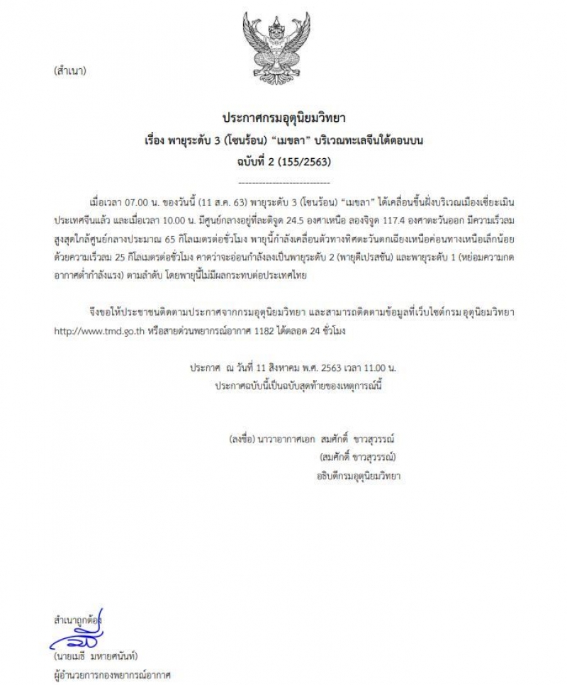 อนึ่ง พายุระดับ 3 (โซนร้อน) เมขลา ได้เคลื่อนขึ้นฝั่งบริเวณเมืองเซี่ยะเมิน ประเทศจีนแล้ว และจะอ่อนกำลังลงเป็นพายุระดับ 2 (พายุดีเปรสชัน) และพายุระดับ 1 (หย่อมความกดอากาศต่ำกำลังแรง) ตามลำดับ โดยพายุนี้ไม่มีผลกระทบต่อประเทศไทย