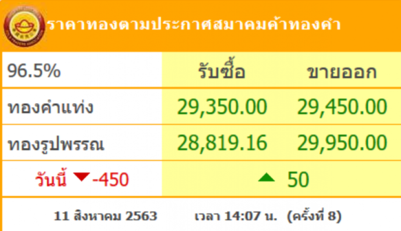 วันที่ 11 สิงหาคม 2563 ผู้สื่อข่าวรายงานว่า สมาคมค้าทองคำรายงาน ราคาทองคำไทย หลังจากที่ราคาเริ่มปรับลดลงอย่างต่อเนื่อง หลังจากที่ได้มีการปรับพุ่งขึ้นต่อเนื่องมาตลอด ทำให้ราคาทองขึ้งสูงสุดในรอบปี ซึ่งขณะนี้ตั้งแต่เมื่อช่วงเช้าเปิดตลาดที่ผ่าน ก็ได้ปรับไปถึง 8 ครั้งแล้ว โดยรวมปรับลง 450 บาท ทำให้ราคาทอง ร่วงลงมาจากบาทละ 3 หมื่นแล้ว ราคาล่าสุดหลังปรับครั้งที่ 8 ทองคำแท่ง รับซื้อบาทละ 29,350 ขายออกบาทละ 29,450 บาท ส่วนทองรูปพรรณ รับซื้อบาทละ 28,819.16 ขายออกบาทละ 29,950 บาท