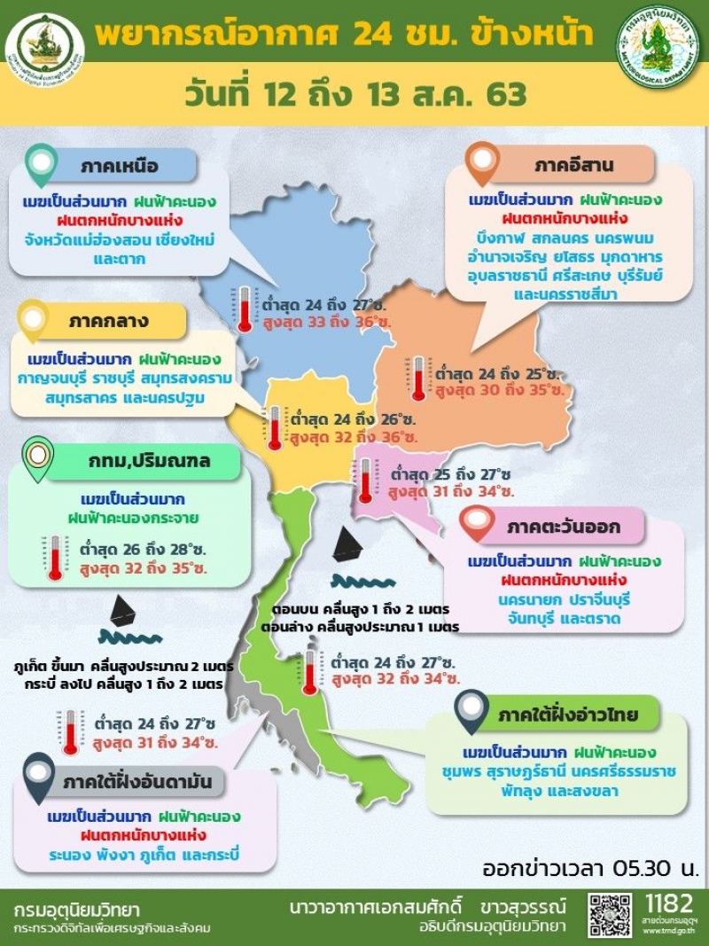 อากาศประจำวันที่ 12 สิงหาคม 2563 ลักษณะอากาศทั่วไป อากาศ 24 ชั่วโมงข้างหน้า มรสุมตะวันตกเฉียงใต้ที่พัดปกคลุมทะเลอันดามัน ประเทศไทย และอ่าวไทยมีกำลังปานกลาง ในขณะที่มีลมตะวันออกเฉียงใต้พัดเข้ามาปกคลุมภาคตะวันออกเฉียงเหนือตอนล่าง ทำให้ยังคงมีฝนตกหนักบางพื้นที่บริเวณด้านรับลมของภาคเหนือ ภาคตะวันออกเฉียงเหนือตอนล่าง ภาคตะวันออก และภาคใต้ ขอให้ประชาชนที่อาศัยในพื้นที่เสี่ยงภัยบริเวณภาคเหนือ ระวังอันตรายจากฝนตกหนักและฝนที่ตกสะสมไว้ด้วย