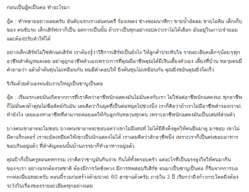 อุ๊ด ไม่ได้โรยด้วยกลีบกุหลาบเลย มีถนนลาดยางแค่นิดเดียว ถือว่ามาเร็วแล้วก็มาไกล แต่ถ้าหากว่าย้อนกลับมาดู ไม่ได้อยู่ที่ว่าการมาไกลมาใกล้ มันอยู่ที่ว่าเราผ่านอะไรมาบ้าง สิ่งที่ผ่านมามันเป็นความรู้สึกดี หรือว่าความรู้สึกไม่ดี เราก็จะเอามาปรับเรื่อยๆเป็นสเต็ปๆ ส่วนลึกๆแล้วมันอยู่ที่ตัวเราเอง